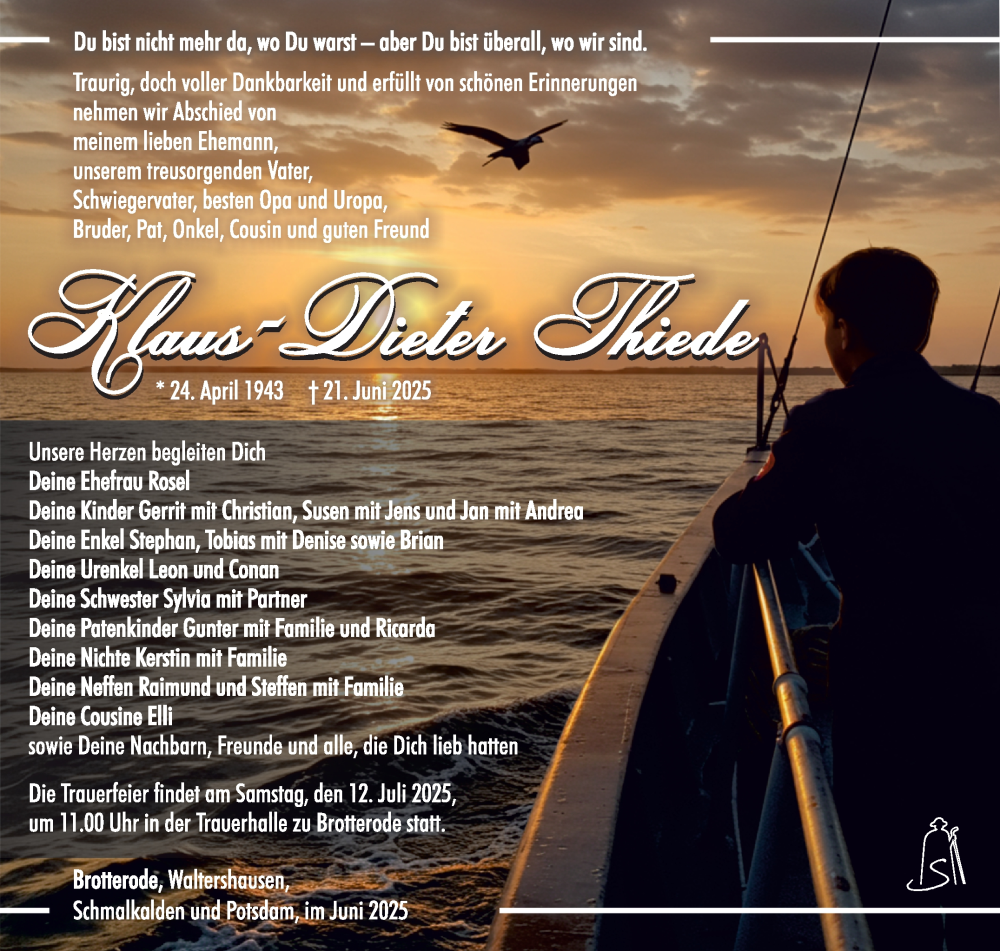 Hier finden Sie alle Traueranzeigen aus der Zeitung, die bisher für Klaus-Dieter Thiede erschienen sind. Weitere Traueranzeigen, die in der Zeitung erscheinen, werden hier ebenfalls aufgelistet