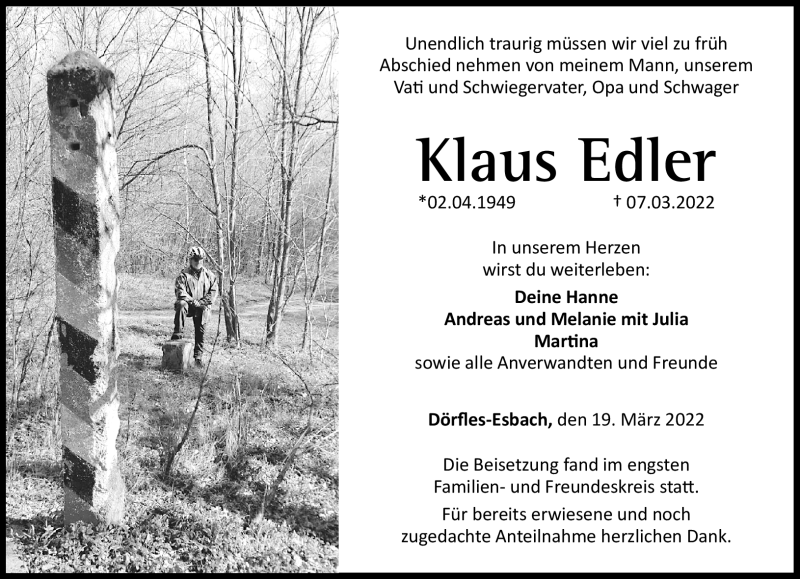 Hier finden Sie alle Traueranzeigen aus der Zeitung, die bisher für Klaus Edler erschienen sind. Weitere Traueranzeigen, die in der Zeitung erscheinen, werden hier ebenfalls aufgelistet