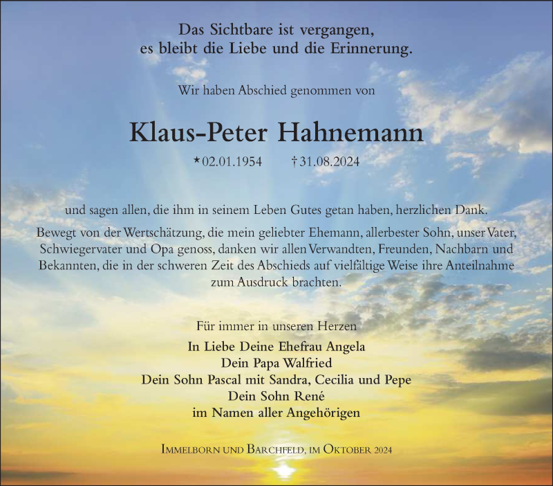 Hier finden Sie alle Traueranzeigen aus der Zeitung, die bisher für Klaus-Peter Hahnemann erschienen sind. Weitere Traueranzeigen, die in der Zeitung erscheinen, werden hier ebenfalls aufgelistet