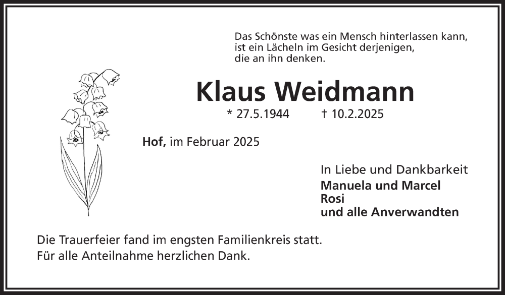 Hier finden Sie alle Traueranzeigen aus der Zeitung, die bisher für Klaus Weidmann erschienen sind. Weitere Traueranzeigen, die in der Zeitung erscheinen, werden hier ebenfalls aufgelistet