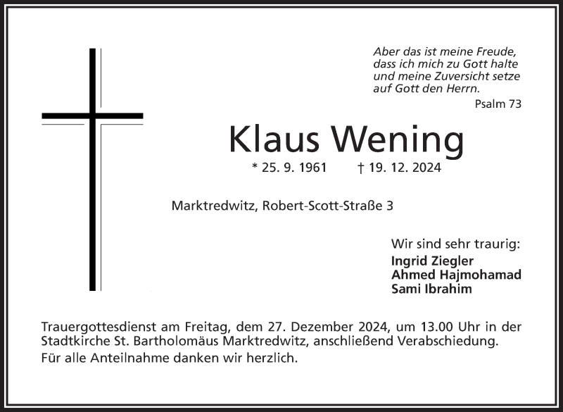 Hier finden Sie alle Traueranzeigen aus der Zeitung, die bisher für Klaus Wening erschienen sind. Weitere Traueranzeigen, die in der Zeitung erscheinen, werden hier ebenfalls aufgelistet