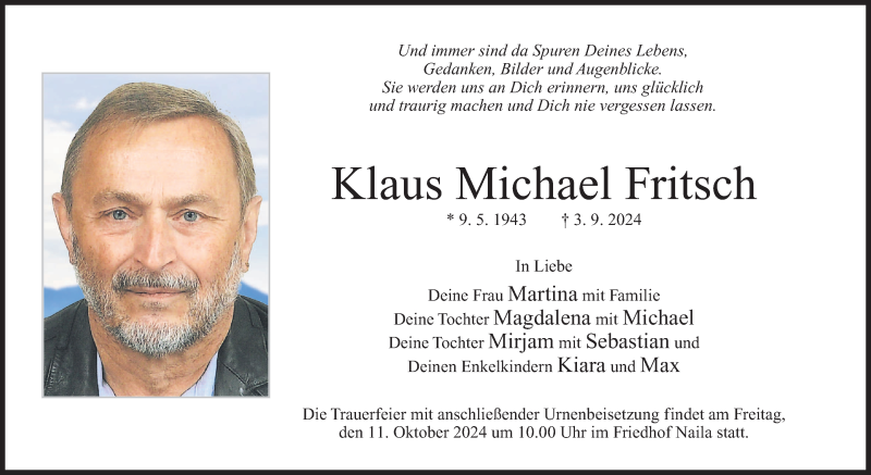 Hier finden Sie alle Traueranzeigen aus der Zeitung, die bisher für Klaus Michael Fritsch erschienen sind. Weitere Traueranzeigen, die in der Zeitung erscheinen, werden hier ebenfalls aufgelistet