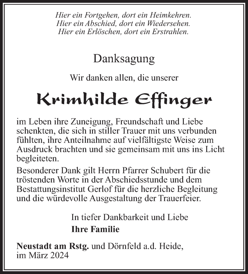 Hier finden Sie alle Traueranzeigen aus der Zeitung, die bisher für Krimhilde Effinger erschienen sind. Weitere Traueranzeigen, die in der Zeitung erscheinen, werden hier ebenfalls aufgelistet