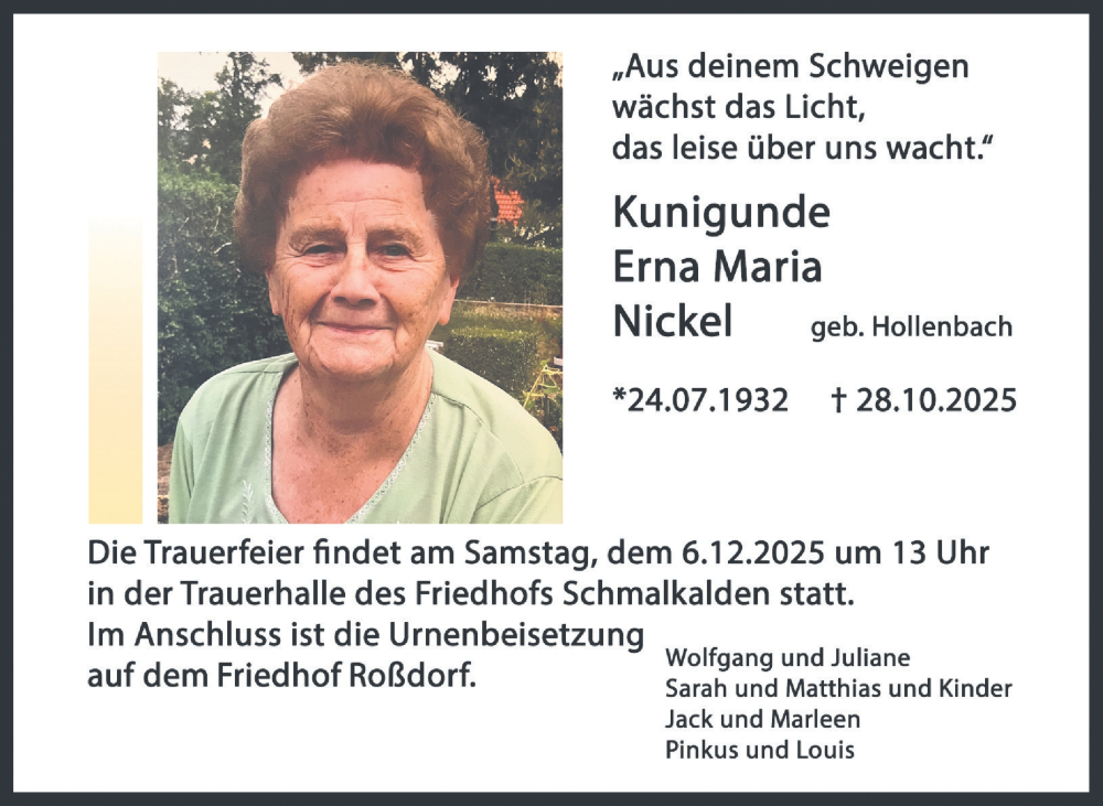Hier finden Sie alle Traueranzeigen aus der Zeitung, die bisher für Kunigunde Nickel erschienen sind. Weitere Traueranzeigen, die in der Zeitung erscheinen, werden hier ebenfalls aufgelistet