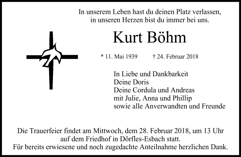 Hier finden Sie alle Traueranzeigen aus der Zeitung, die bisher für Kurt Böhm erschienen sind. Weitere Traueranzeigen, die in der Zeitung erscheinen, werden hier ebenfalls aufgelistet