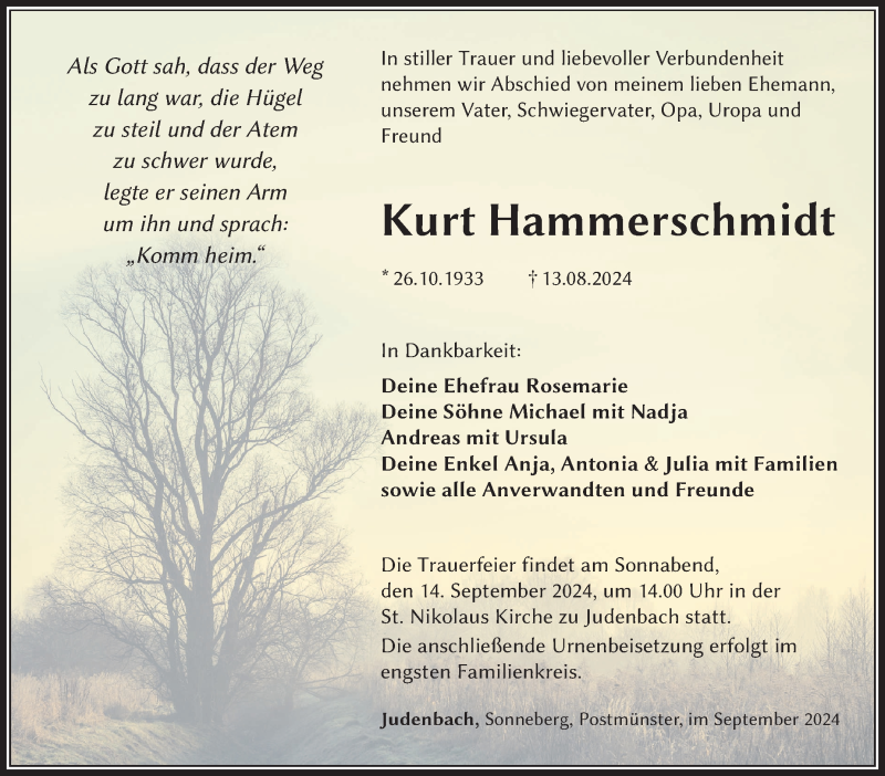Hier finden Sie alle Traueranzeigen aus der Zeitung, die bisher für Kurt Hammerschmidt erschienen sind. Weitere Traueranzeigen, die in der Zeitung erscheinen, werden hier ebenfalls aufgelistet