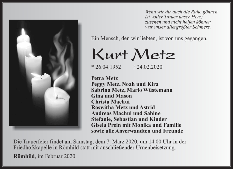 Hier finden Sie alle Traueranzeigen aus der Zeitung, die bisher für Kurt Metz erschienen sind. Weitere Traueranzeigen, die in der Zeitung erscheinen, werden hier ebenfalls aufgelistet