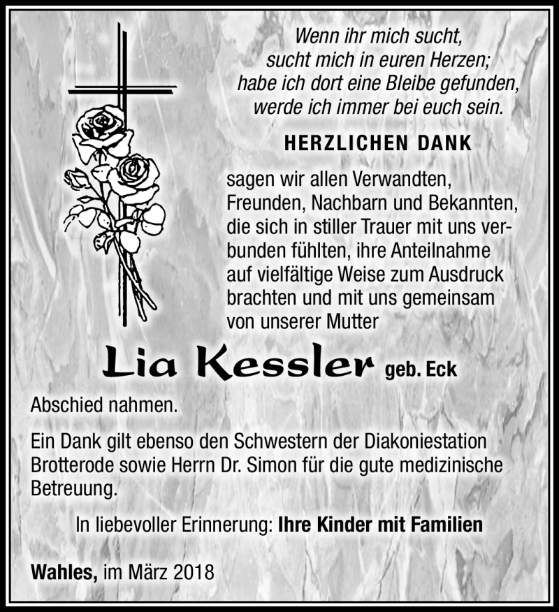 Hier finden Sie alle Traueranzeigen aus der Zeitung, die bisher für Lia Kessler erschienen sind. Weitere Traueranzeigen, die in der Zeitung erscheinen, werden hier ebenfalls aufgelistet