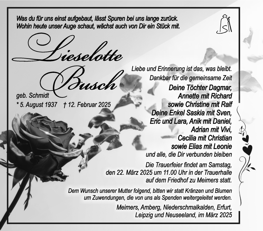 Hier finden Sie alle Traueranzeigen aus der Zeitung, die bisher für Lieselotte Busch erschienen sind. Weitere Traueranzeigen, die in der Zeitung erscheinen, werden hier ebenfalls aufgelistet