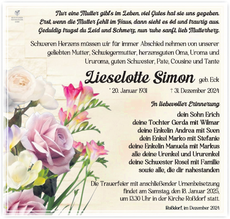 Hier finden Sie alle Traueranzeigen aus der Zeitung, die bisher für Lieselotte Simon erschienen sind. Weitere Traueranzeigen, die in der Zeitung erscheinen, werden hier ebenfalls aufgelistet
