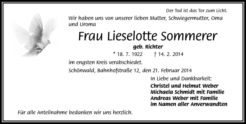 Hier finden Sie alle Traueranzeigen aus der Zeitung, die bisher für Lieselotte Sommerer erschienen sind. Weitere Traueranzeigen, die in der Zeitung erscheinen, werden hier ebenfalls aufgelistet