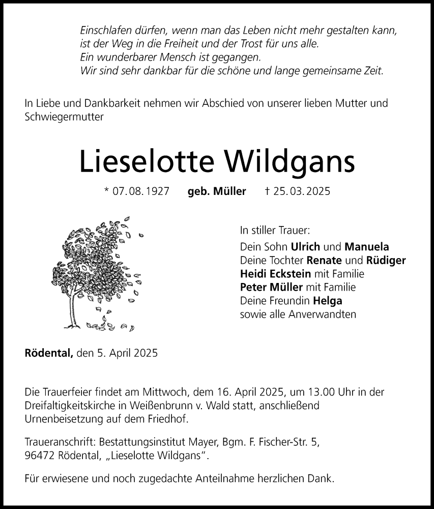 Hier finden Sie alle Traueranzeigen aus der Zeitung, die bisher für Lieselotte Wildgans erschienen sind. Weitere Traueranzeigen, die in der Zeitung erscheinen, werden hier ebenfalls aufgelistet