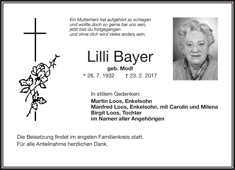 Hier finden Sie alle Traueranzeigen aus der Zeitung, die bisher für Lilli Bayer erschienen sind. Weitere Traueranzeigen, die in der Zeitung erscheinen, werden hier ebenfalls aufgelistet