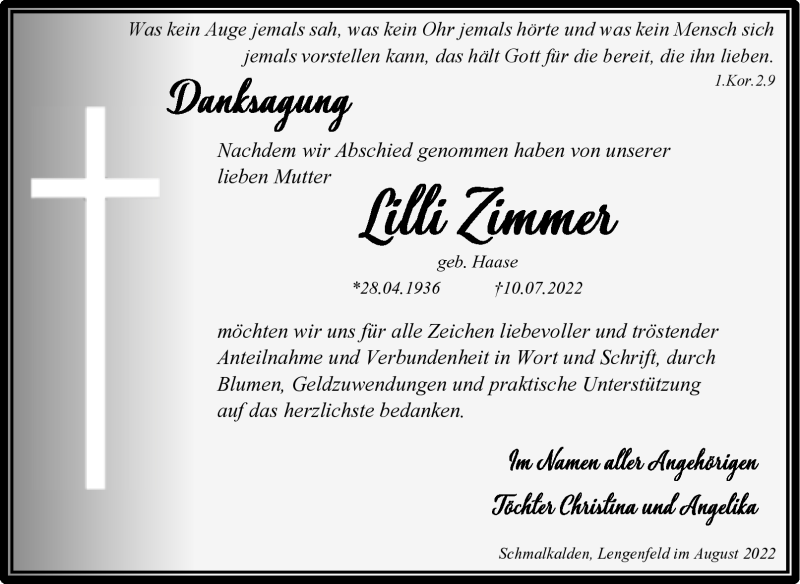 Hier finden Sie alle Traueranzeigen aus der Zeitung, die bisher für Lilli Zimmer erschienen sind. Weitere Traueranzeigen, die in der Zeitung erscheinen, werden hier ebenfalls aufgelistet