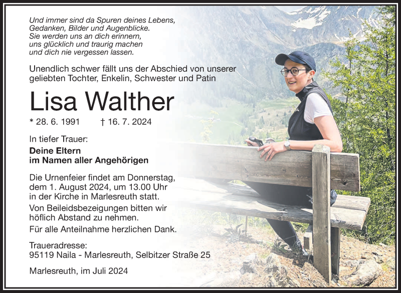 Hier finden Sie alle Traueranzeigen aus der Zeitung, die bisher für Lisa Walther erschienen sind. Weitere Traueranzeigen, die in der Zeitung erscheinen, werden hier ebenfalls aufgelistet