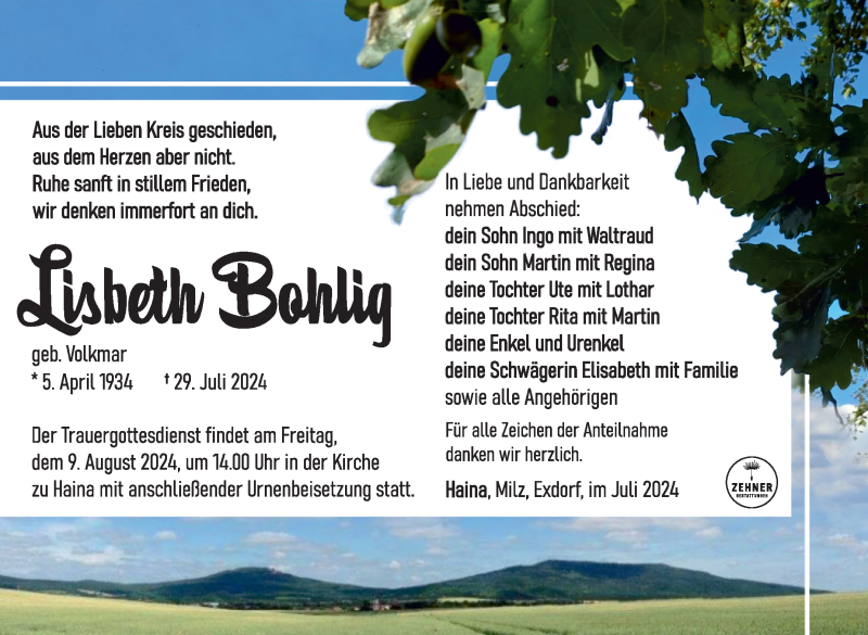 Hier finden Sie alle Traueranzeigen aus der Zeitung, die bisher für Lisbeth Bohlig erschienen sind. Weitere Traueranzeigen, die in der Zeitung erscheinen, werden hier ebenfalls aufgelistet