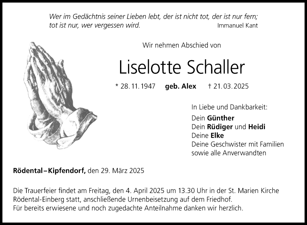 Hier finden Sie alle Traueranzeigen aus der Zeitung, die bisher für Liselotte Schaller erschienen sind. Weitere Traueranzeigen, die in der Zeitung erscheinen, werden hier ebenfalls aufgelistet