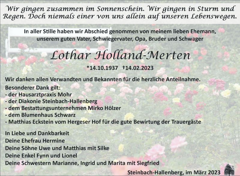 Hier finden Sie alle Traueranzeigen aus der Zeitung, die bisher für Lothar Holland-Merten erschienen sind. Weitere Traueranzeigen, die in der Zeitung erscheinen, werden hier ebenfalls aufgelistet