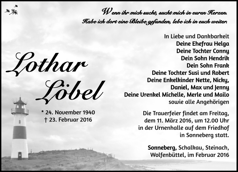 Hier finden Sie alle Traueranzeigen aus der Zeitung, die bisher für lOTHAR lÖBEL erschienen sind. Weitere Traueranzeigen, die in der Zeitung erscheinen, werden hier ebenfalls aufgelistet