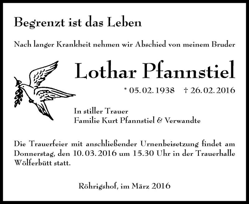 Hier finden Sie alle Traueranzeigen aus der Zeitung, die bisher für Lothar Pfannstiel erschienen sind. Weitere Traueranzeigen, die in der Zeitung erscheinen, werden hier ebenfalls aufgelistet