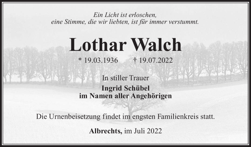 Hier finden Sie alle Traueranzeigen aus der Zeitung, die bisher für Lothar Walch erschienen sind. Weitere Traueranzeigen, die in der Zeitung erscheinen, werden hier ebenfalls aufgelistet