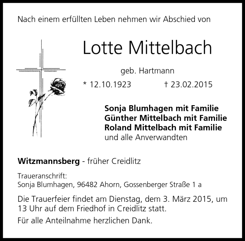 Hier finden Sie alle Traueranzeigen aus der Zeitung, die bisher für Lotte Mittelbach erschienen sind. Weitere Traueranzeigen, die in der Zeitung erscheinen, werden hier ebenfalls aufgelistet