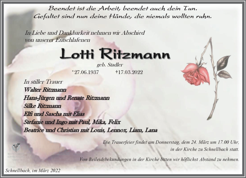 Hier finden Sie alle Traueranzeigen aus der Zeitung, die bisher für Lotti Ritzmann erschienen sind. Weitere Traueranzeigen, die in der Zeitung erscheinen, werden hier ebenfalls aufgelistet