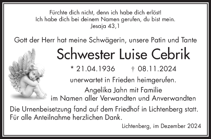 Hier finden Sie alle Traueranzeigen aus der Zeitung, die bisher für Luise Cebrik erschienen sind. Weitere Traueranzeigen, die in der Zeitung erscheinen, werden hier ebenfalls aufgelistet