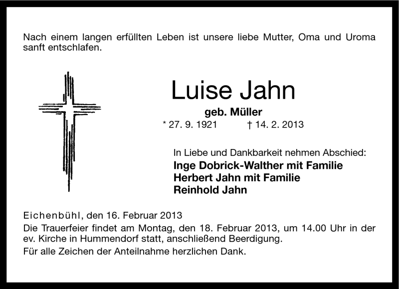 Hier finden Sie alle Traueranzeigen aus der Zeitung, die bisher für Luise Jahn erschienen sind. Weitere Traueranzeigen, die in der Zeitung erscheinen, werden hier ebenfalls aufgelistet