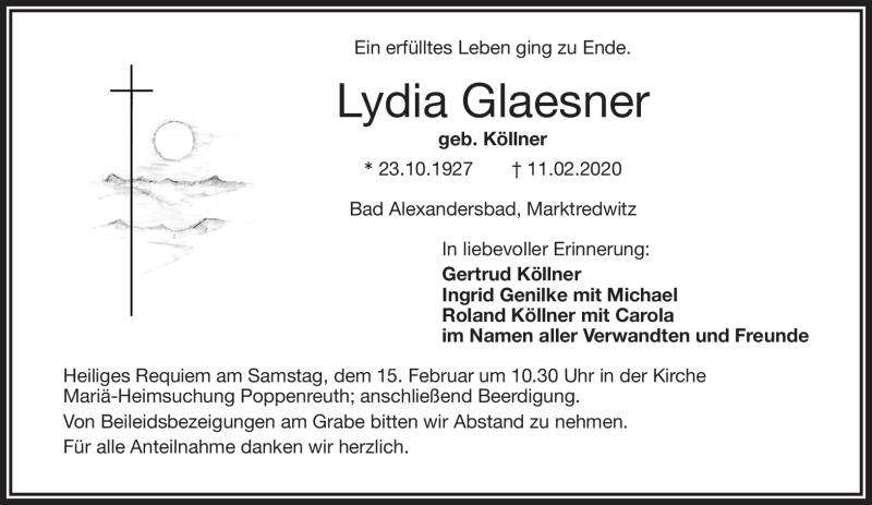 Hier finden Sie alle Traueranzeigen aus der Zeitung, die bisher für Lydia Glaesner erschienen sind. Weitere Traueranzeigen, die in der Zeitung erscheinen, werden hier ebenfalls aufgelistet