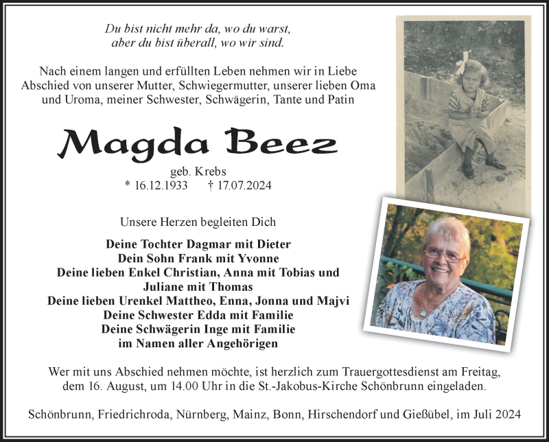 Hier finden Sie alle Traueranzeigen aus der Zeitung, die bisher für Magda Beez erschienen sind. Weitere Traueranzeigen, die in der Zeitung erscheinen, werden hier ebenfalls aufgelistet