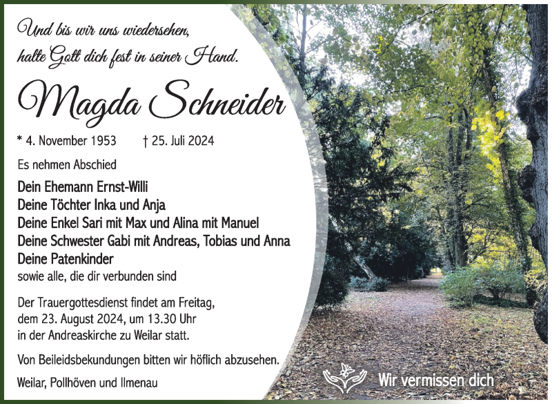 Hier finden Sie alle Traueranzeigen aus der Zeitung, die bisher für Magda Schneider erschienen sind. Weitere Traueranzeigen, die in der Zeitung erscheinen, werden hier ebenfalls aufgelistet