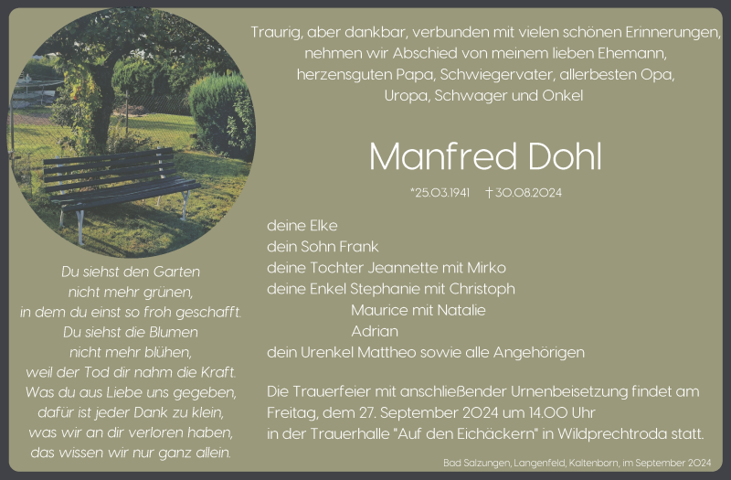 Hier finden Sie alle Traueranzeigen aus der Zeitung, die bisher für Manfred Dohl erschienen sind. Weitere Traueranzeigen, die in der Zeitung erscheinen, werden hier ebenfalls aufgelistet