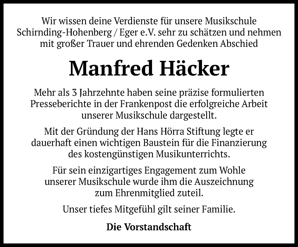Hier finden Sie alle Traueranzeigen aus der Zeitung, die bisher für Manfred Häcker erschienen sind. Weitere Traueranzeigen, die in der Zeitung erscheinen, werden hier ebenfalls aufgelistet