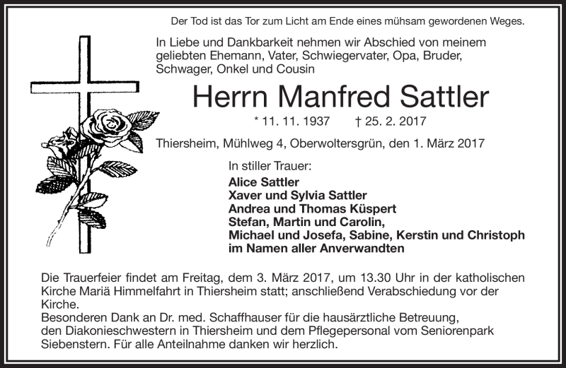 Hier finden Sie alle Traueranzeigen aus der Zeitung, die bisher für Manfred Sattler erschienen sind. Weitere Traueranzeigen, die in der Zeitung erscheinen, werden hier ebenfalls aufgelistet