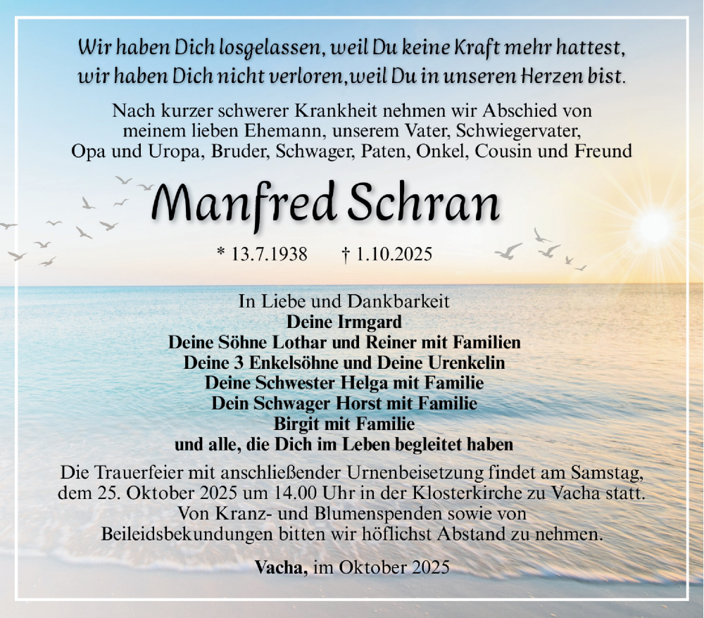 Hier finden Sie alle Traueranzeigen aus der Zeitung, die bisher für Manfred Schran erschienen sind. Weitere Traueranzeigen, die in der Zeitung erscheinen, werden hier ebenfalls aufgelistet