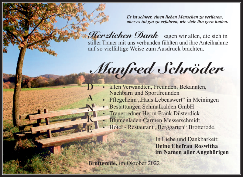 Hier finden Sie alle Traueranzeigen aus der Zeitung, die bisher für Manfred Schröder erschienen sind. Weitere Traueranzeigen, die in der Zeitung erscheinen, werden hier ebenfalls aufgelistet