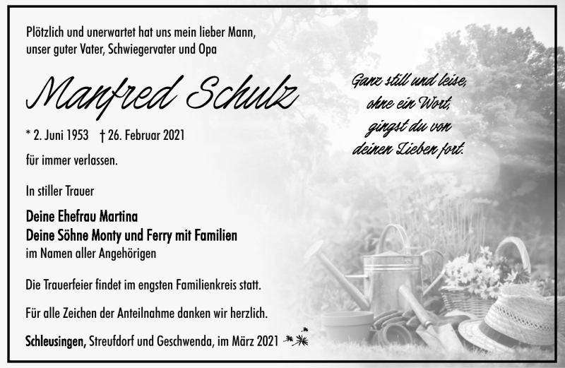 Hier finden Sie alle Traueranzeigen aus der Zeitung, die bisher für Manfred Schulz erschienen sind. Weitere Traueranzeigen, die in der Zeitung erscheinen, werden hier ebenfalls aufgelistet