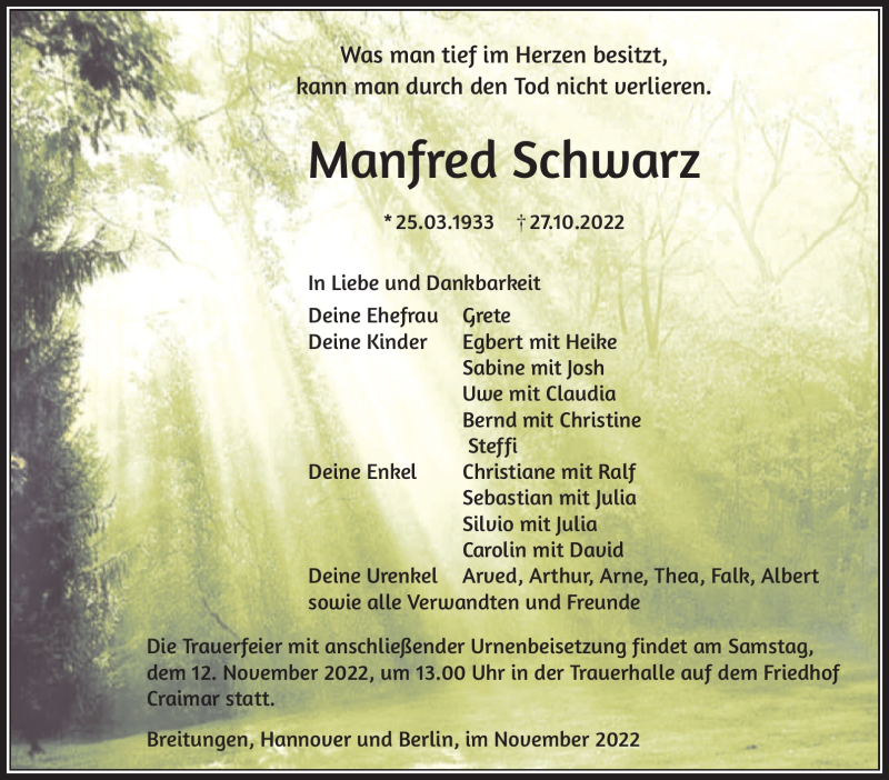 Hier finden Sie alle Traueranzeigen aus der Zeitung, die bisher für Manfred Schwarz erschienen sind. Weitere Traueranzeigen, die in der Zeitung erscheinen, werden hier ebenfalls aufgelistet