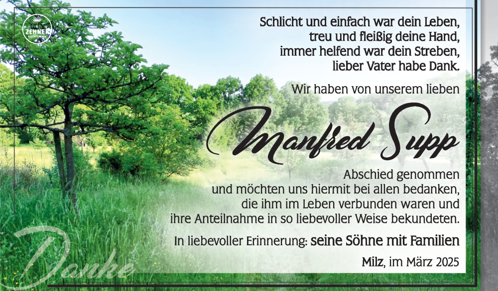 Hier finden Sie alle Traueranzeigen aus der Zeitung, die bisher für Manfred Supp erschienen sind. Weitere Traueranzeigen, die in der Zeitung erscheinen, werden hier ebenfalls aufgelistet