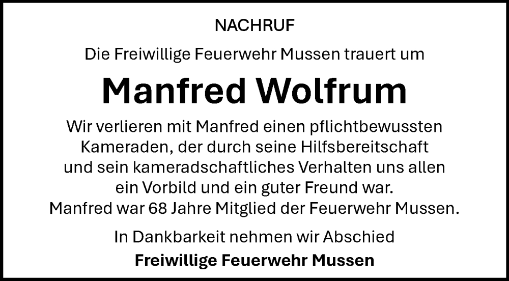 Hier finden Sie alle Traueranzeigen aus der Zeitung, die bisher für Manfred Wolfrum erschienen sind. Weitere Traueranzeigen, die in der Zeitung erscheinen, werden hier ebenfalls aufgelistet