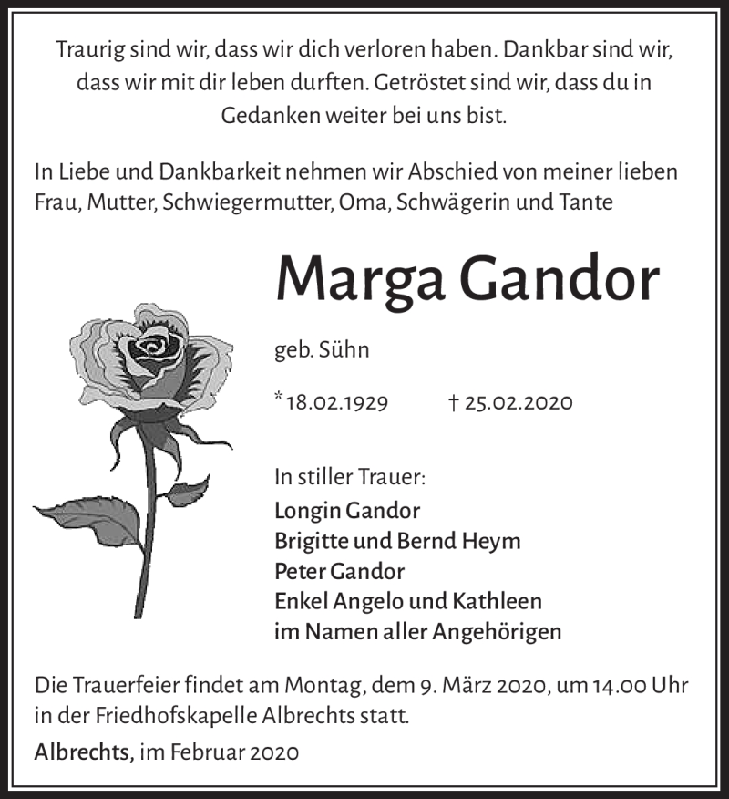 Hier finden Sie alle Traueranzeigen aus der Zeitung, die bisher für Marga Gandor erschienen sind. Weitere Traueranzeigen, die in der Zeitung erscheinen, werden hier ebenfalls aufgelistet