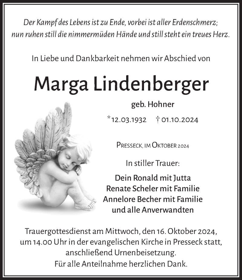 Hier finden Sie alle Traueranzeigen aus der Zeitung, die bisher für Marga Lindenberger erschienen sind. Weitere Traueranzeigen, die in der Zeitung erscheinen, werden hier ebenfalls aufgelistet