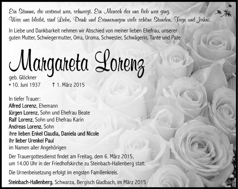 Hier finden Sie alle Traueranzeigen aus der Zeitung, die bisher für Margareta Lorenz erschienen sind. Weitere Traueranzeigen, die in der Zeitung erscheinen, werden hier ebenfalls aufgelistet