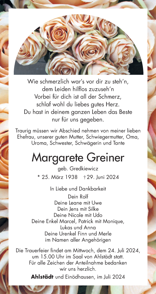 Hier finden Sie alle Traueranzeigen aus der Zeitung, die bisher für Margarete Greiner erschienen sind. Weitere Traueranzeigen, die in der Zeitung erscheinen, werden hier ebenfalls aufgelistet