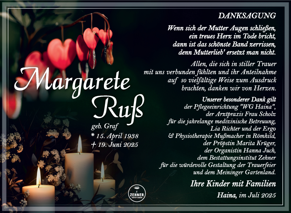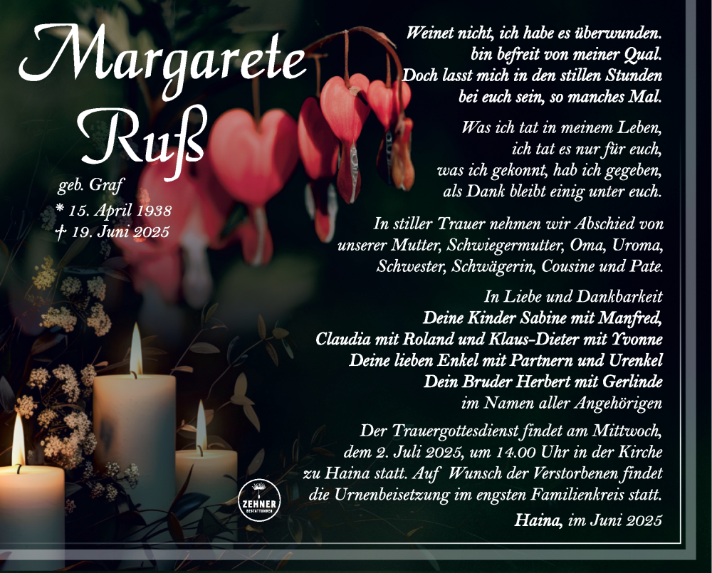 Hier finden Sie alle Traueranzeigen aus der Zeitung, die bisher für Margarete Ruß erschienen sind. Weitere Traueranzeigen, die in der Zeitung erscheinen, werden hier ebenfalls aufgelistet