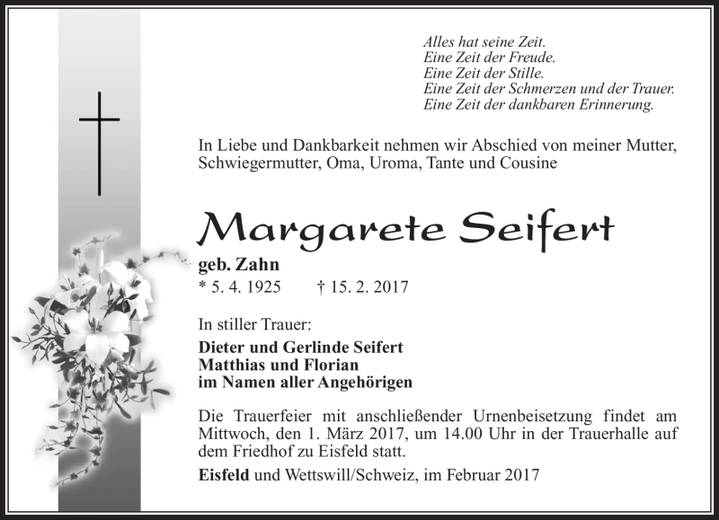 Hier finden Sie alle Traueranzeigen aus der Zeitung, die bisher für Margarete Seifert erschienen sind. Weitere Traueranzeigen, die in der Zeitung erscheinen, werden hier ebenfalls aufgelistet