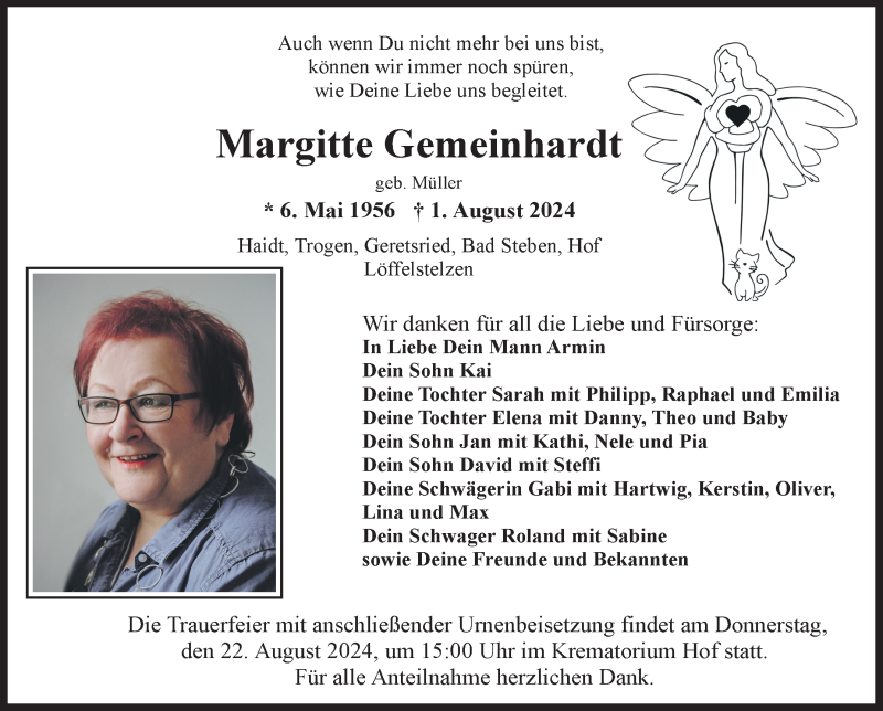 Hier finden Sie alle Traueranzeigen aus der Zeitung, die bisher für Margitte Gemeinhardt erschienen sind. Weitere Traueranzeigen, die in der Zeitung erscheinen, werden hier ebenfalls aufgelistet