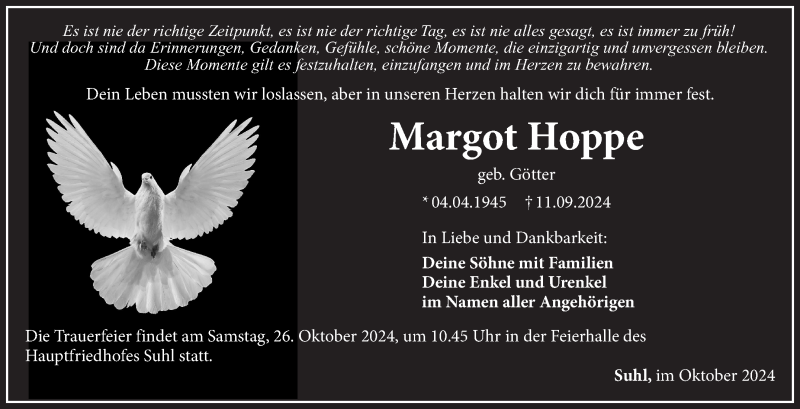 Hier finden Sie alle Traueranzeigen aus der Zeitung, die bisher für Margot Hoppe erschienen sind. Weitere Traueranzeigen, die in der Zeitung erscheinen, werden hier ebenfalls aufgelistet