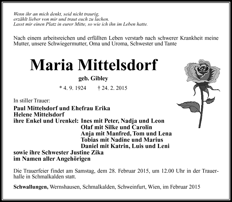Hier finden Sie alle Traueranzeigen aus der Zeitung, die bisher für Maria Mittelsdorf erschienen sind. Weitere Traueranzeigen, die in der Zeitung erscheinen, werden hier ebenfalls aufgelistet